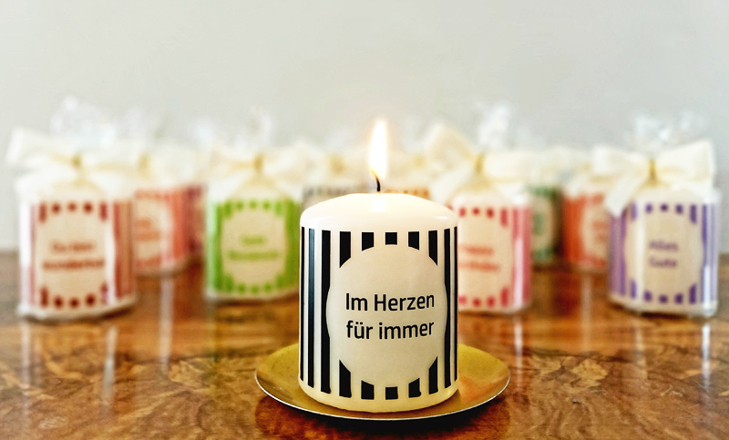 Wortlicht miniFarbe: Lavendel-lilacGröße: 60/50 mm,Verpackt: in Cellophan,mit dekorativer Stoffschleife,Brenndauer: ca 18 Stunden,