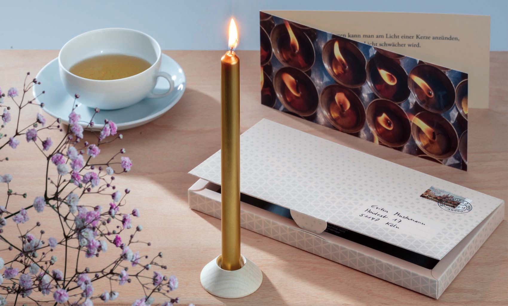 Kerzenfarb: Weiß, Druck: GoldGröße: 20cm x 2,2cm,Verpackt: Cello mit Etikett an HanfbandEAN: 4260348633995